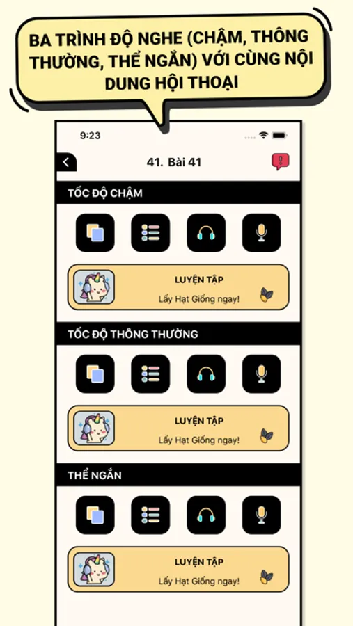 Luyện tập trả lời phản xạ sau khi nghe các câu hội thoại ở bậc sơ cấp. Với mỗi câu hỏi sẽ có hai cách trả lời. Có 3 loại: luyện tập theo tốc độ chậm với câu thể lịch sự, tốc độ thông thường với câu lịch sự, tốc độ nhanh với câu thể ngắn.