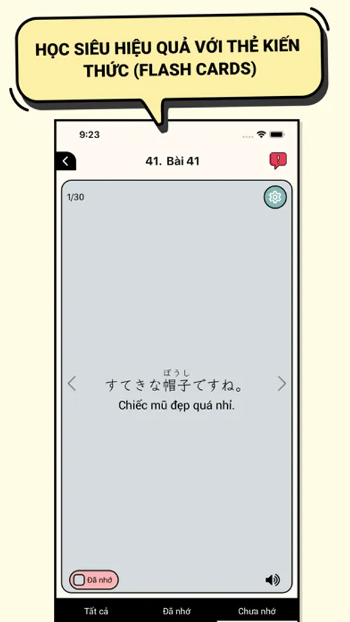 Trong phần flashcard, với những từ đã biết, bạn đánh dấu vào "Đã nhớ", những từ này sẽ tạm ẩn đi, bạn chỉ cần luyện tập những từ chưa nhớ.