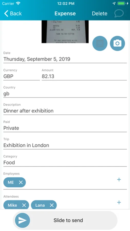 Report expenses and mileage in the app by snapping the receipt and/or enter the mileage directly.