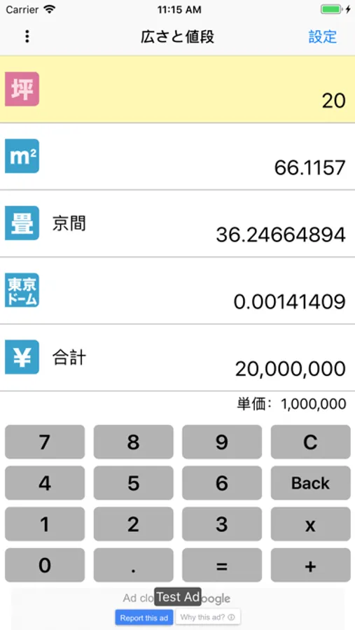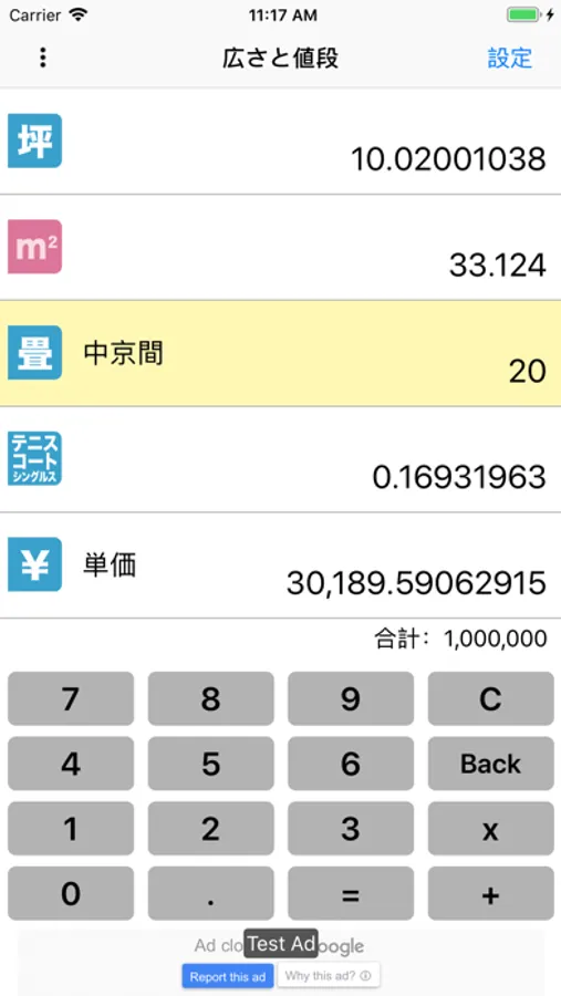 「坪」「m2」「畳」「広さ」「¥」について、それぞれを基準とした値を簡単に算出することができます。