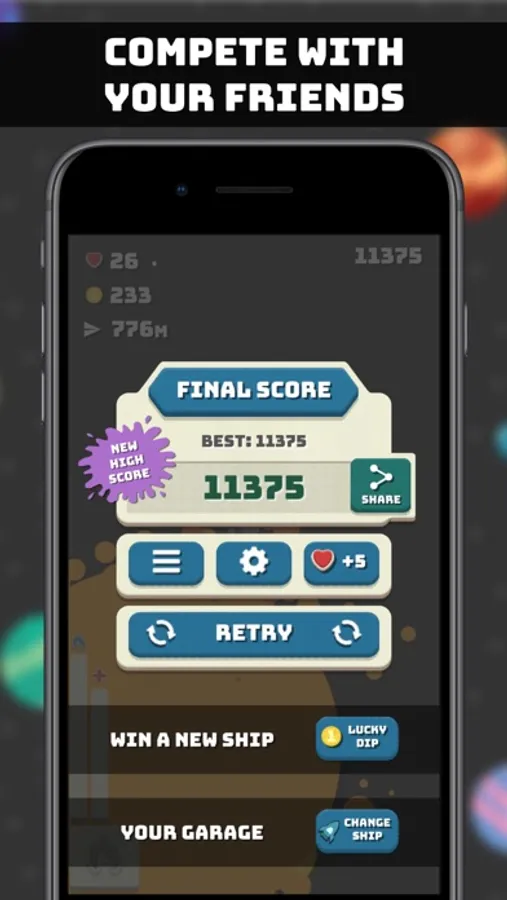 Do you want a challenge? Do you want to fly in outer space? If so Orbit Drift is the game for you. There are over 10 different power-ups you can collect along your way as well as coins and when you collect enough coins you can buy a spin and get more ships to fly through the infinite universe. As you fly your ship through the infinite universe you'll discover different and more dangerous things like wormholes and black holes, the possibilities are infinite. There are 9 ships to collect each with a unique shape and style.