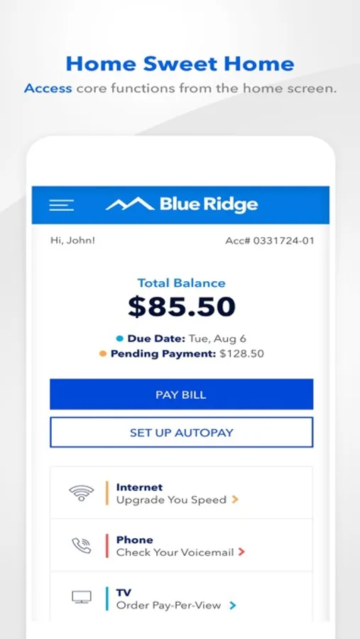 Easily manage many aspects of your Blue Ridge Communications account with the My Blue Ridge App. Whether you need to quickly make a payment, upgrade your internet speed, or order the next big thing on pay-per-view, you can do it right from your phone.