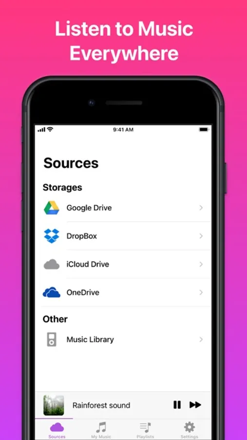• Supported sources: Google Drive, DropBox, iCloud Drive, OneDrive, Apple Music Library.