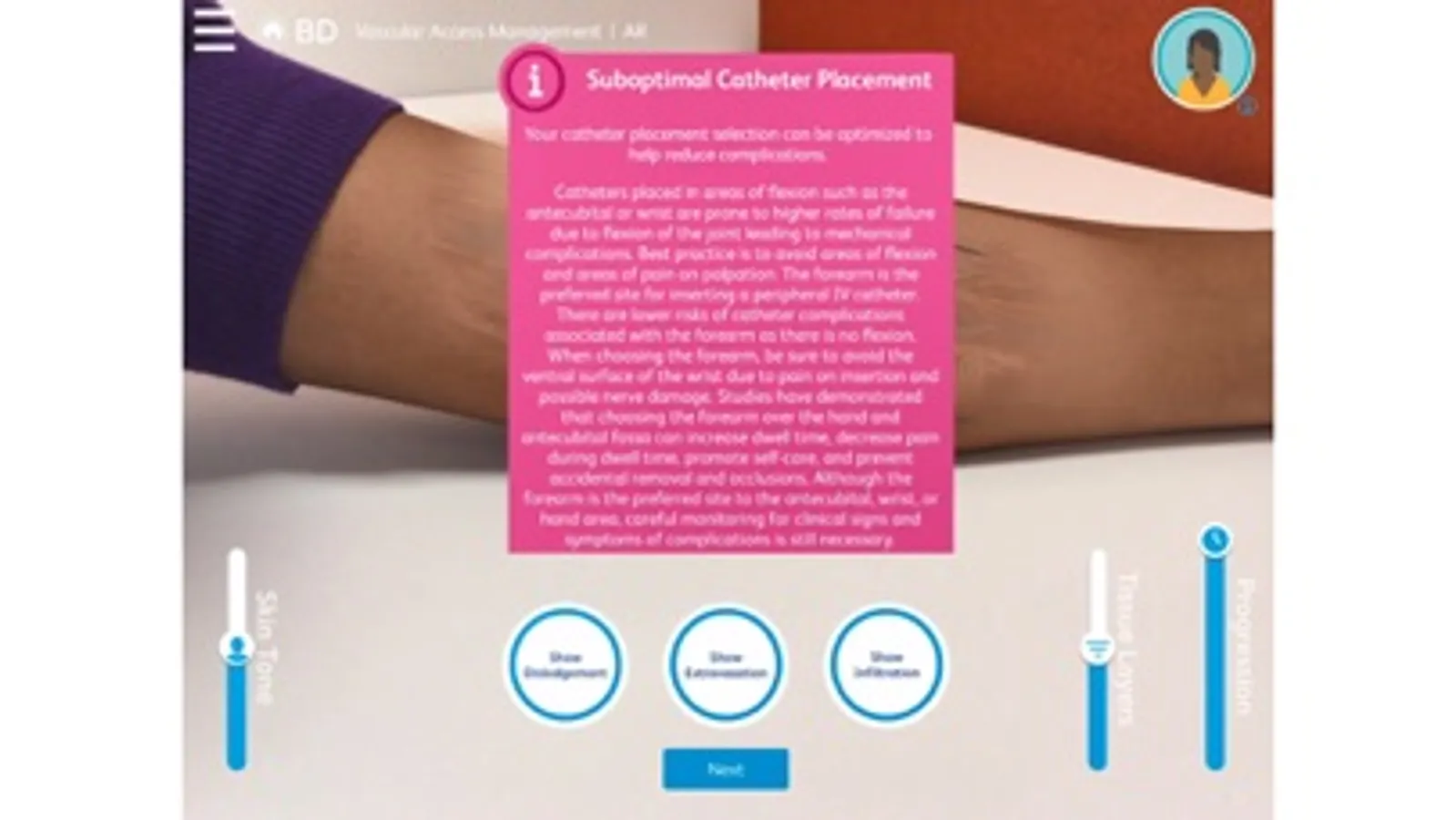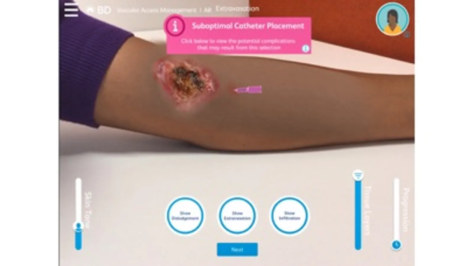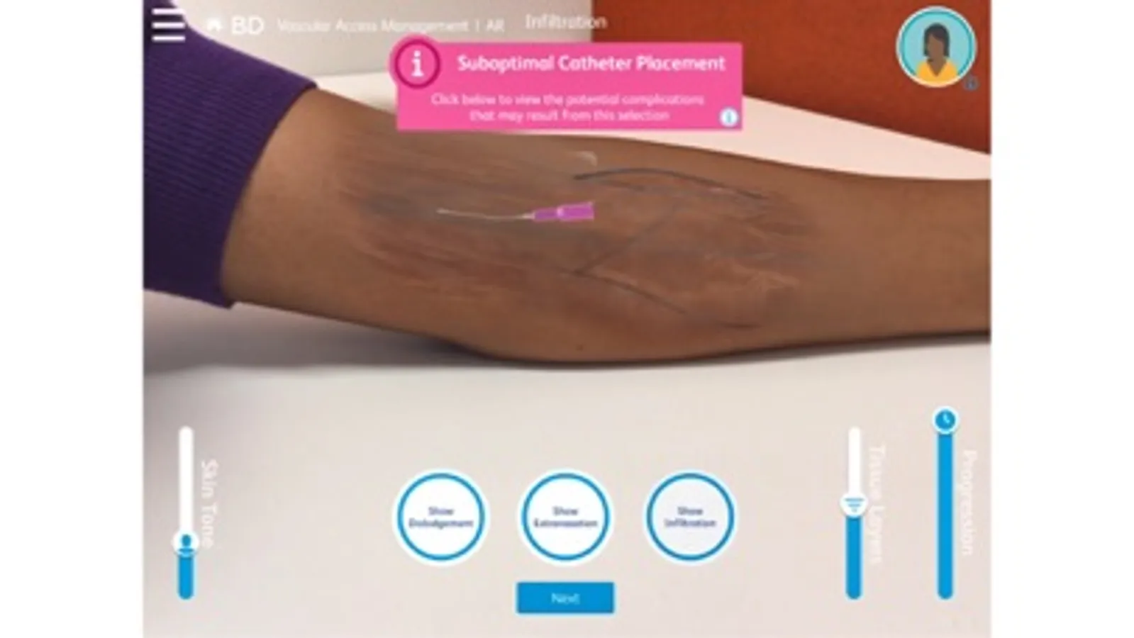 The VAM/AR app uses consequence-based learning to show clinicians how product selection and clinical practices contribute to avoidable peripheral vascular access complications.