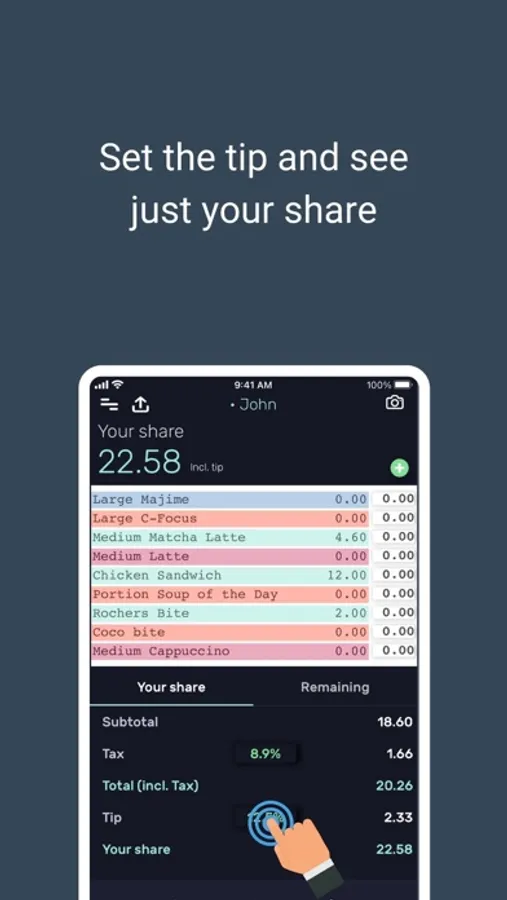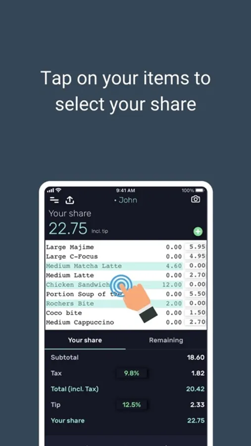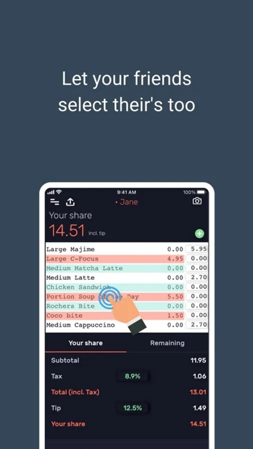 Using our AI, the app recognises the bill, making figuring out who owes what a breeze. Tap your items, and select your share, then tap the next item, or move to the next person. Each person's total is colour coded accordingly, allowing you to switch back and forth easily.