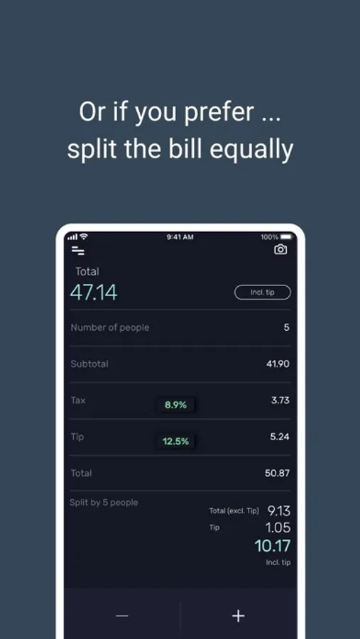 Splitting a bill equally is just as easy. Simply set the tip, and number of people.