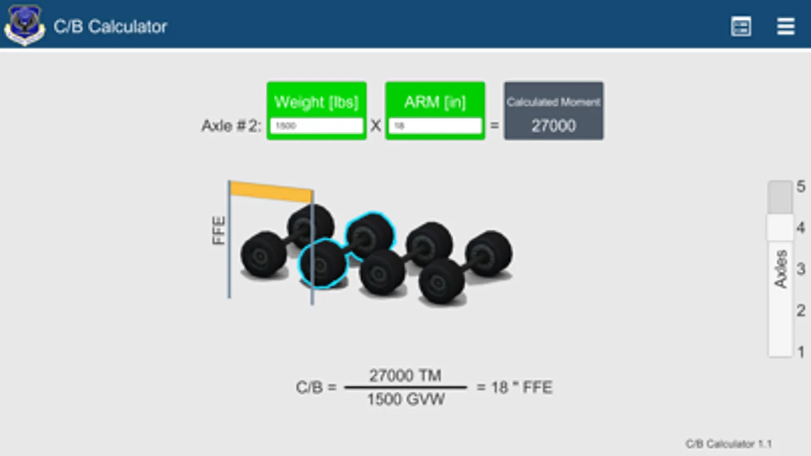 Center of Balance (CB) Calculator –This app provides users a tool to expeditiously calculate the center of balance for equipment with up to 5 axles and a Pallet Train with up to 10 boxes. The user begins by selecting the number of axles they want to figure out the center of balance for, and a representation of those axles are shown on the screen. The user then annotates the distance from front end (FFE) for each axle and the axle’s weight and the text box where the user inputs data will change from red to green when the data is correct. The user repeats the process for each axle and if all information is entered correctly, the app displays the center of balance for the user. If the data is incorrect, the center of balance will not display. Additionally, the app provides the user with a “Form view” where the numerical calculations are displayed. This is a great benefit that helps members ensure they are annotating the data correctly. After the user is complete with the vehicle or pallet train, they can either start a new vehicle, or quit the application.
