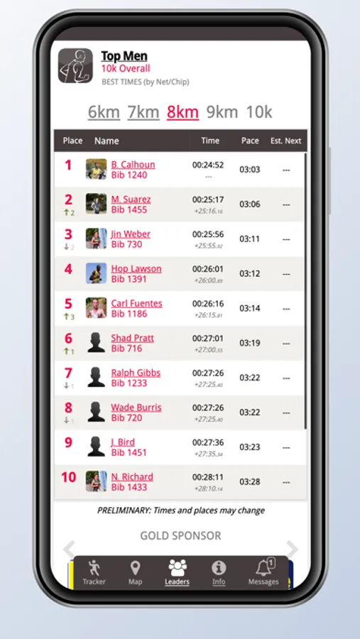 • Participant times, paces, estimates, and places in real-time;