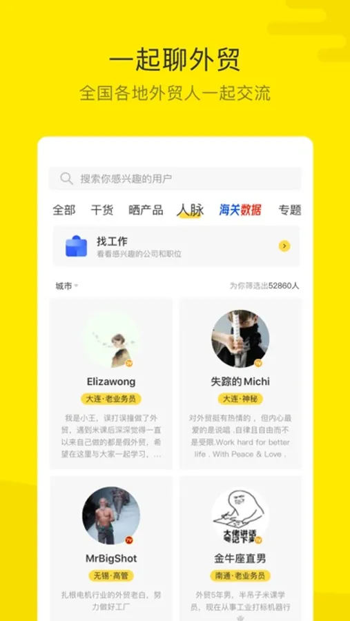 米课圈是定位外贸垂直细分行业的社区,用户来自外贸行业各个领域,在圈内进行交流分享,我们助力用户在圈里学习经验,找到更好的工作,发现更优秀的员工,找到货源,结交更多优秀的外贸人。