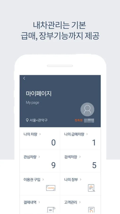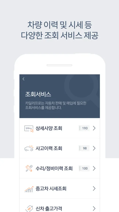 - 차량정보: 차량번호 입력만으로 신차 제원, 중고차시세, 사고이력조회, 수리/정비 이력 등 확인