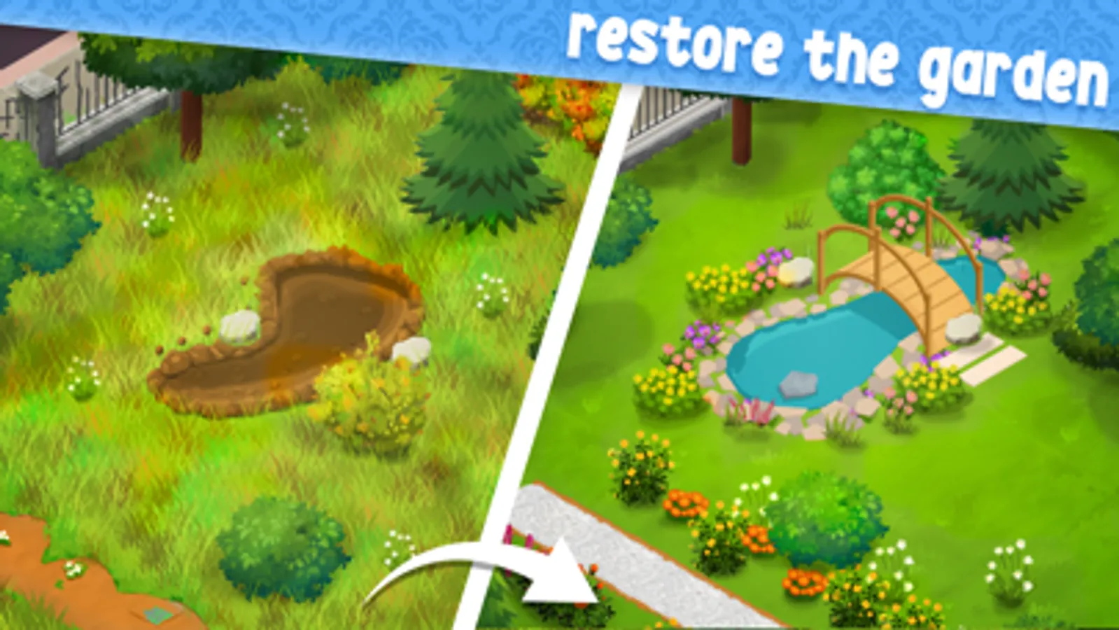 Design rooms and decorate them, mow the lawn, build fountain, cut trees, trim hedges to bring the garden back to his former glory. Meet interesting characters and follow the story line. Match and blast colors to solve challenging puzzles and unlock new chapters. Find hidden garden spots, arrange work with Jim the Worker and build garden by your own design. Discover rooms inside the house and decorate them by your own liking with dozens of customization options.