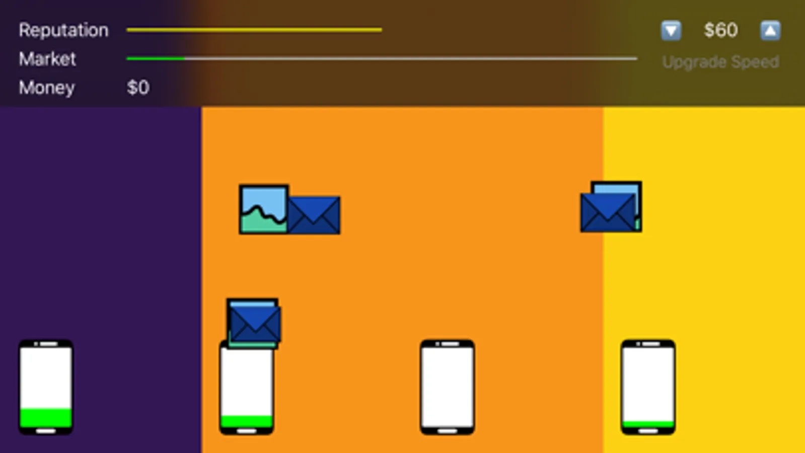 SpaceIO is a game about running a cell phone startup, a startup where you manually manage the backup of user’s data. Your job is to make sure that none of your customer’s phones ever run out of space. Whenever they’re awake, the customers will be sending emails and taking photos like crazy.