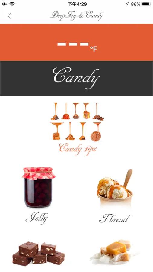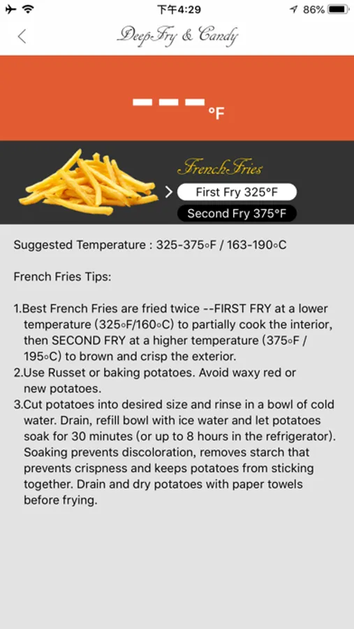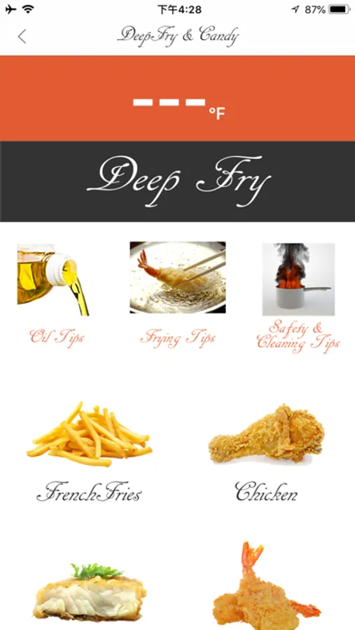 - Select different fried foods and candy with default Set Temperatures and customized Set Temperatures.