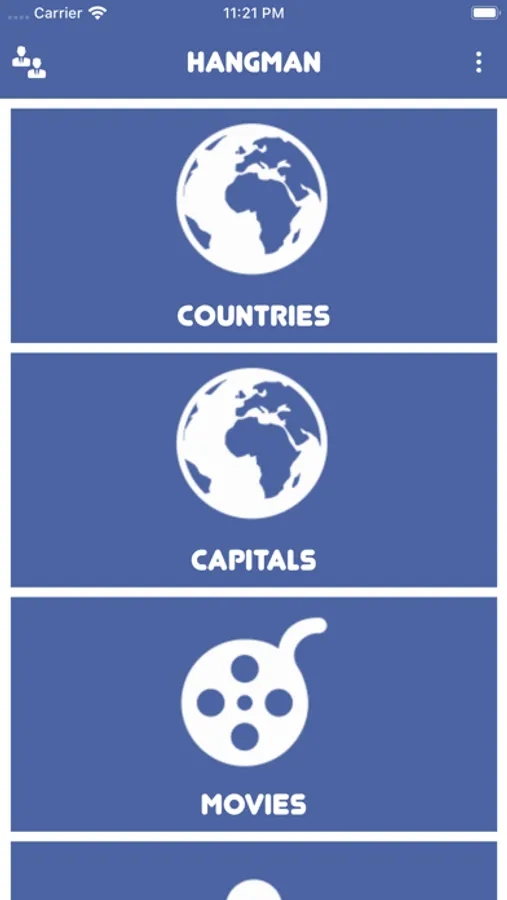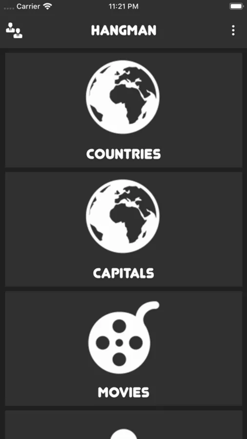 Countries, Capitals, Movies, Celebs, Important people, Cars, Animals, Fruits, Food, Actions, Travel, Idioms, Halloween, Chemistry, Football/Soccer teams, Football/Soccer players, Seas, Jobs, Body parts, Household items