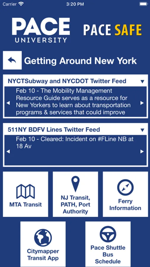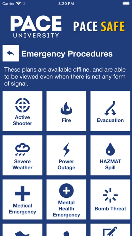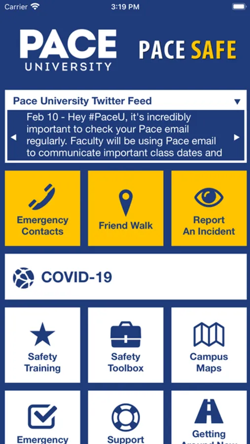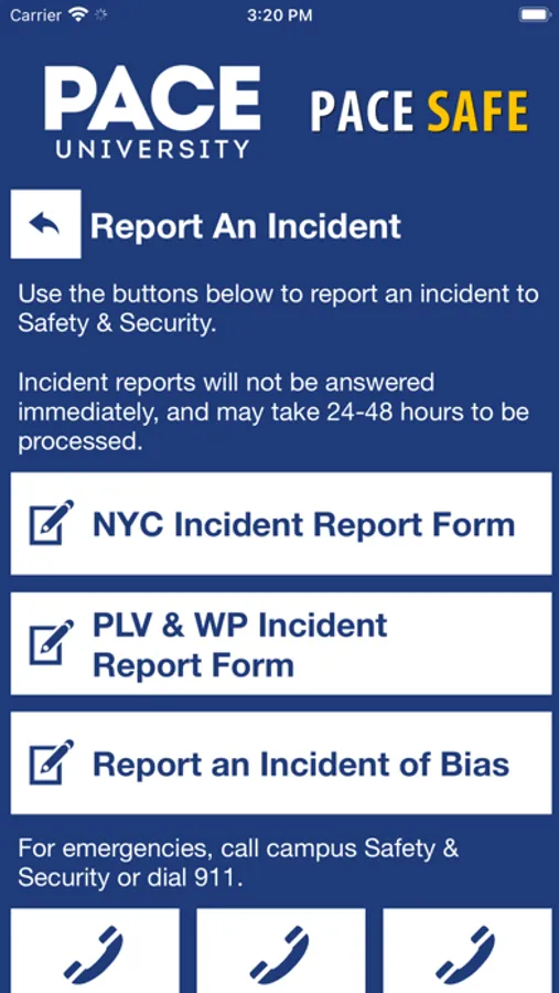 - Incident Reporting: Multiple ways to report a safety/security concern directly to Pace University security.