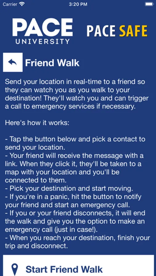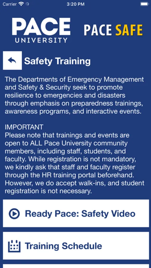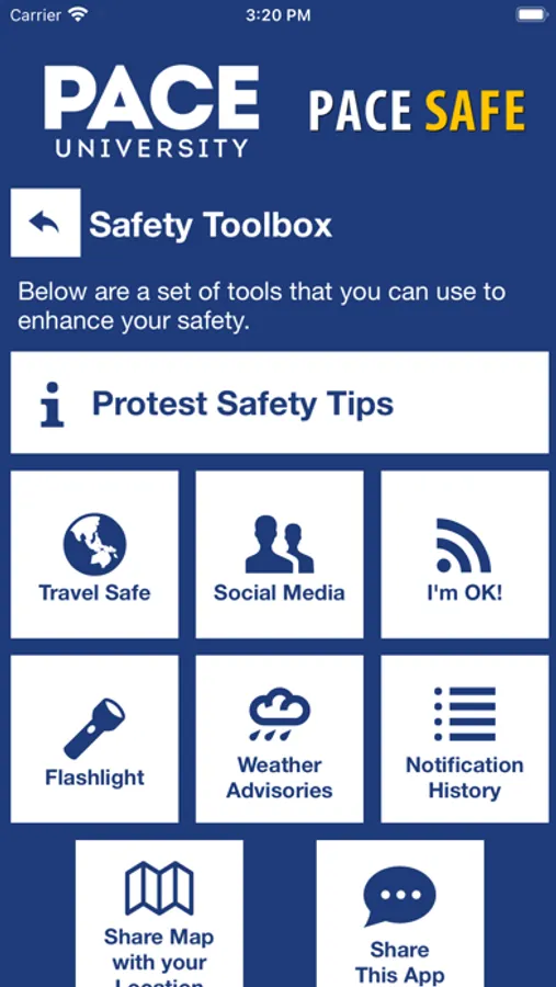Pace Safe is the official safety app of Pace University. It is the only app that integrates with Pace University's safety and security systems. Safety & Security has worked to develop a unique app that provides students, faculty and staff with added safety on the Pace University campus. The app will send you important safety alerts and provide instant access to campus safety resources.