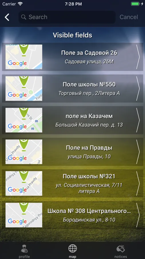 - Выбирайте любое поле на карте или ищите нужное через поиск.