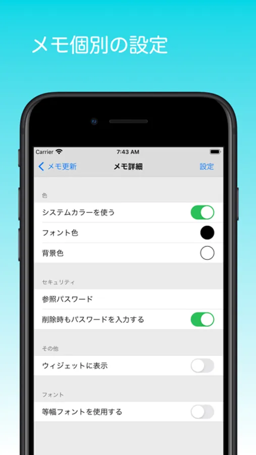 アプリの色は黄、ピンク、青、緑、白、黒の6色から選択可能です。