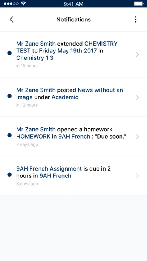 Calendar: the Calendar provides parents, teachers and students a personalised view of what's coming up for the day or in the future. Students can also receive reminders when the due date for their work is approaching