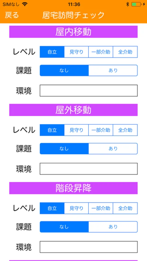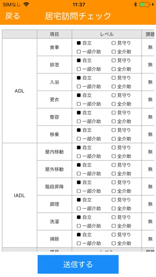 ○「居宅訪問チェックシートアプリ」を使うことで、日常生活動作(ADL)や手段的日常生活活動(IADL)に関する項目から、自立度や介助の度合いを把握することができます。