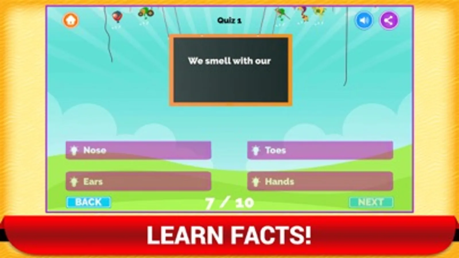 General knowledge is important for kids. Most parents and teachers have difficulty in teaching this to their kids. This is why The Learning Apps has developed this General Knowledge app for kids. This game is so fun that your kids will learn general knowledge willingly. This app contains a lot of trivia questions and answers that will increase the general knowledge of your kids.