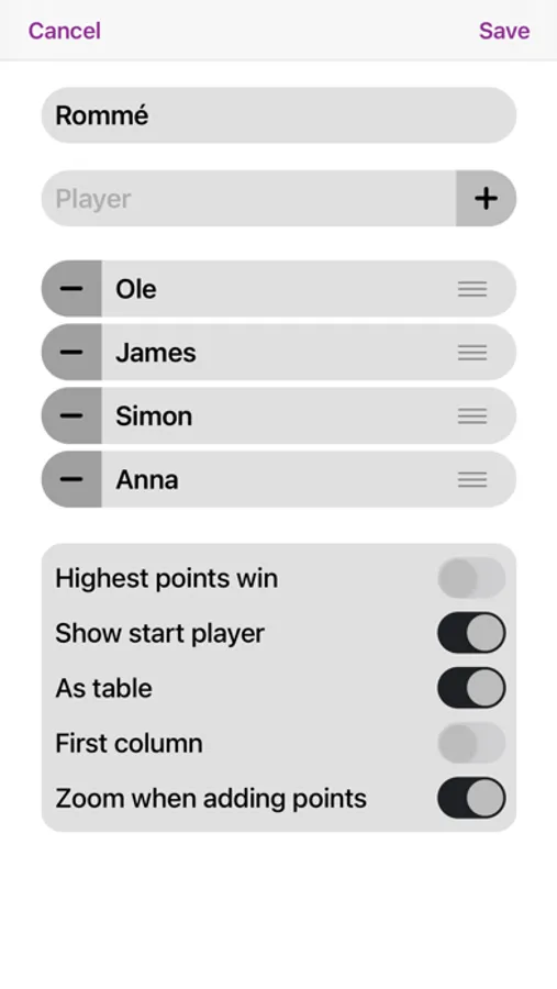 The app automatically adds the points of each round together and indicates who is in the lead. But you can also see how many points a player made each round.