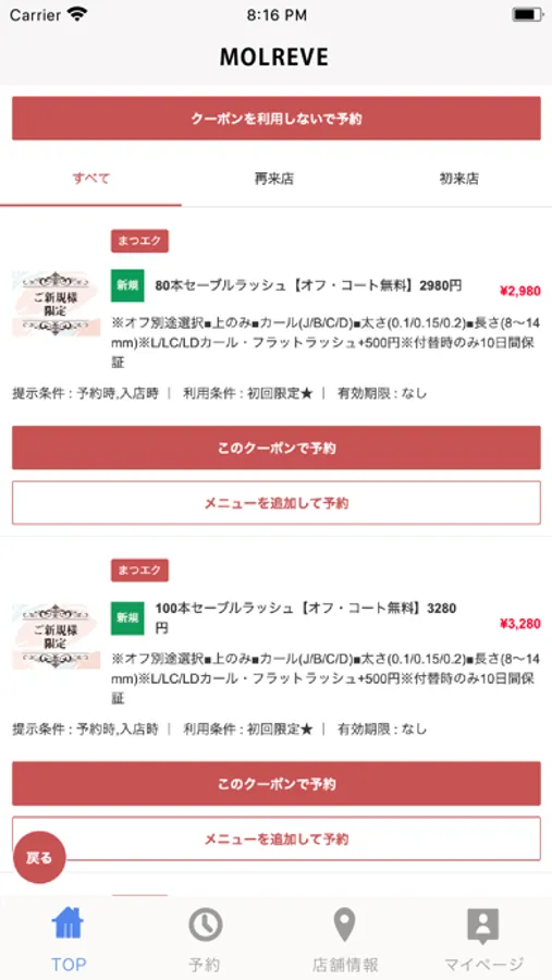 お得なクーポンが配信されます。ネット予約時にクーポン利用での予約も可能なので来店時もスムーズに施術頂けます。