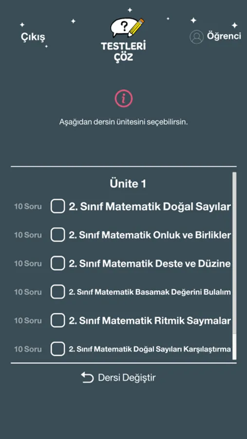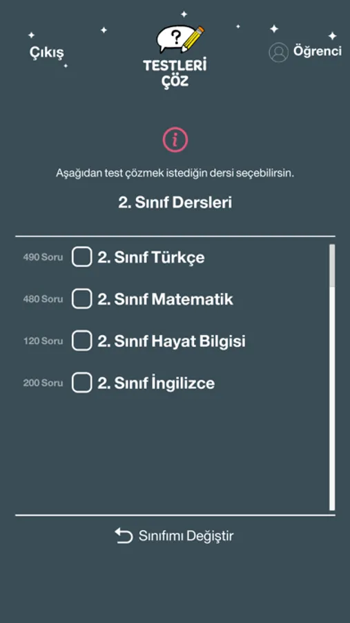 TESTLERİ ÇÖZ UYGULAMASINDA HANGİ DERSLER VAR?