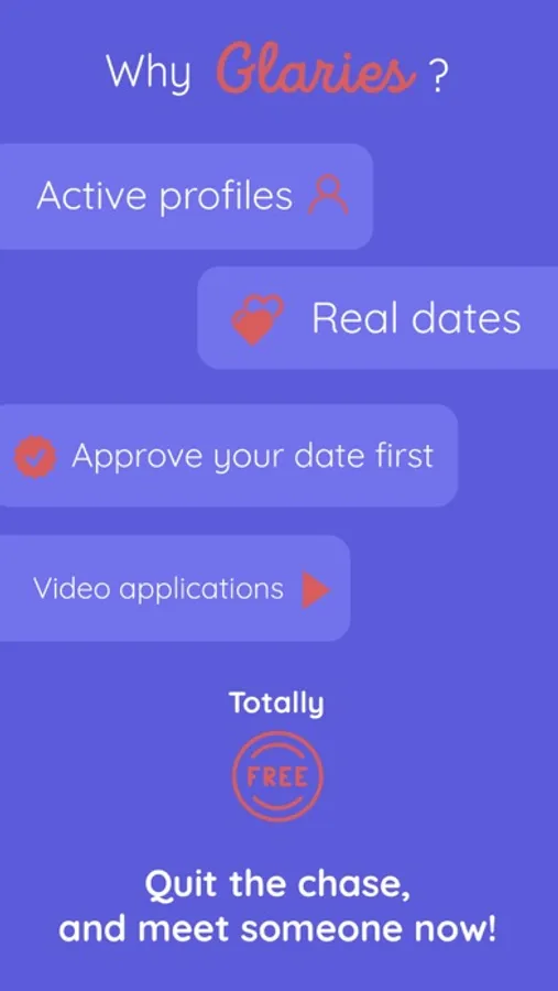 With Glaries, you say goodbye to small talk. Goodbye boring chat, and waiting three hours or days for their reply, and say hello to meeting that special someone IRL!