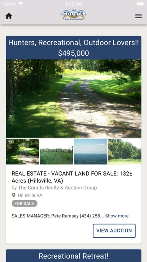 Welcome to the Counts Realty & Auction Group mobile bidding app! This dynamic app allows you to (1) stay informed about our upcoming auctions; (2) view items that interest you; (3) get notifications when you've been outbid; (4) bid no matter where you are located (or set and forget your maximum bid to let our platform automatically bid the lowest possible winning bid for you). This is the go-to-source for up-to-the-minute information on all of our auctions and listings.