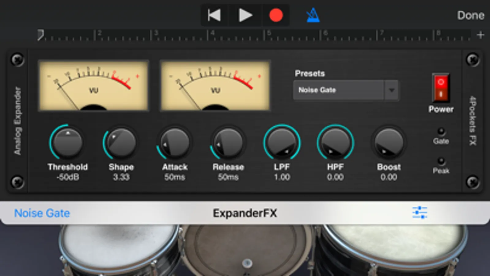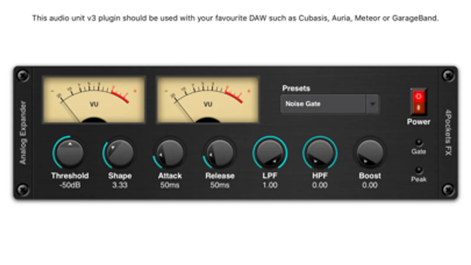 This is an AUv3 compatible audio expander which can be used as a plugin with your favourite DAW such as Cubasis, Meteor, Auria or GarageBand. It supports a graphical interface and presets with stereo metering to monitor signal levels.