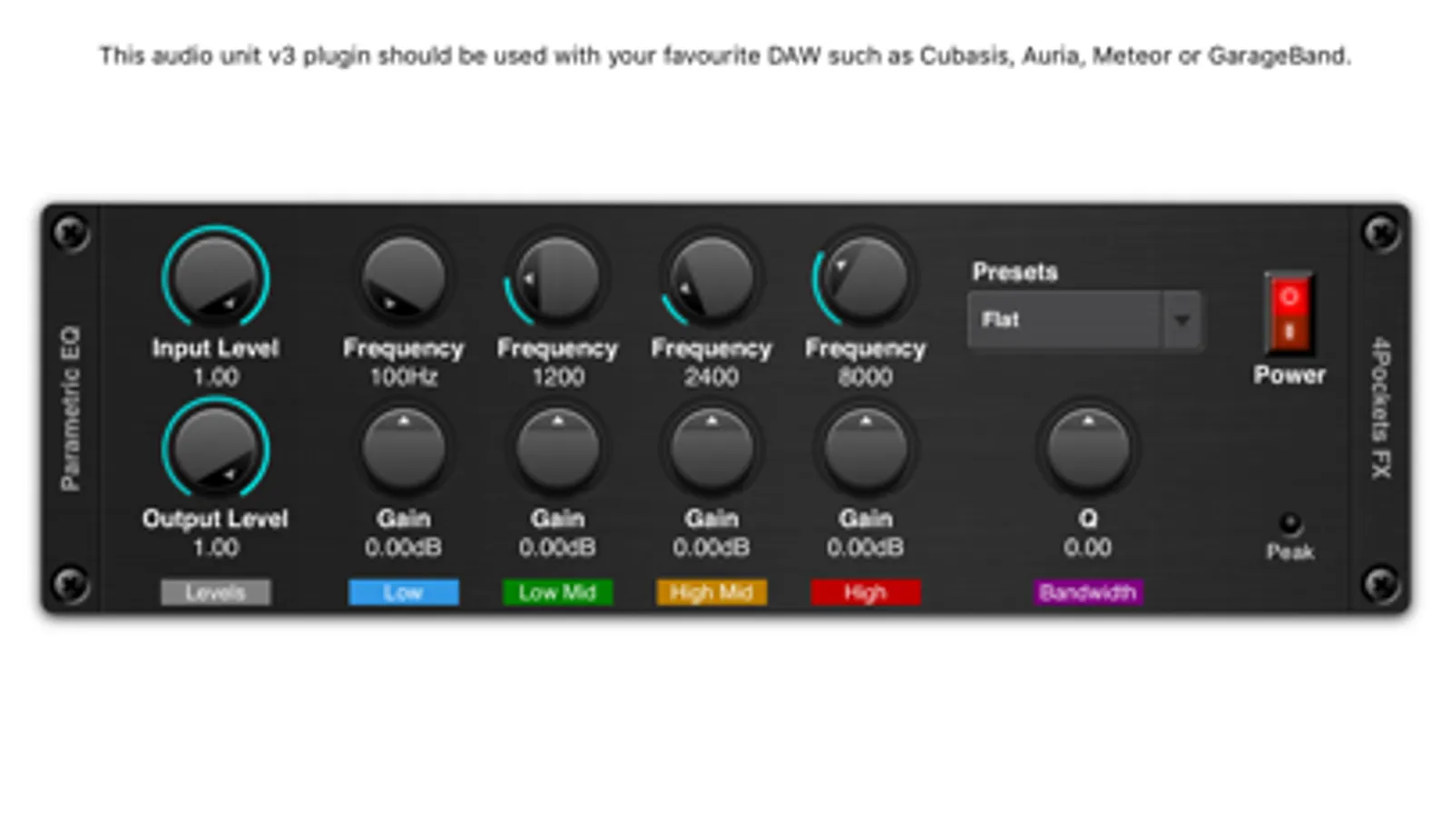 This is an AUv3 compatible stereo parametric equalizer which can be used as a plugin with your favourite DAW such as Cubasis, Meteor, Auria or GarageBand. It supports a graphical interface and presets with stereo metering to monitor signal levels.