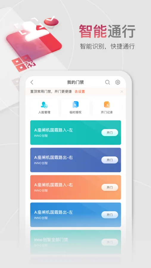 【智能通行】旗下办公楼可享使用二维码、人脸无感通行闸机功能,更快捷、更安全。