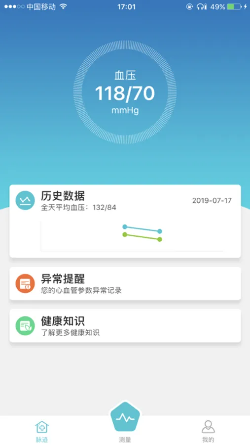 脉迹血压计由上海脉感科技有限公司开发,是一款配合脉迹手环使用的应用程序,用于测量和管理使用者的血压、心率。