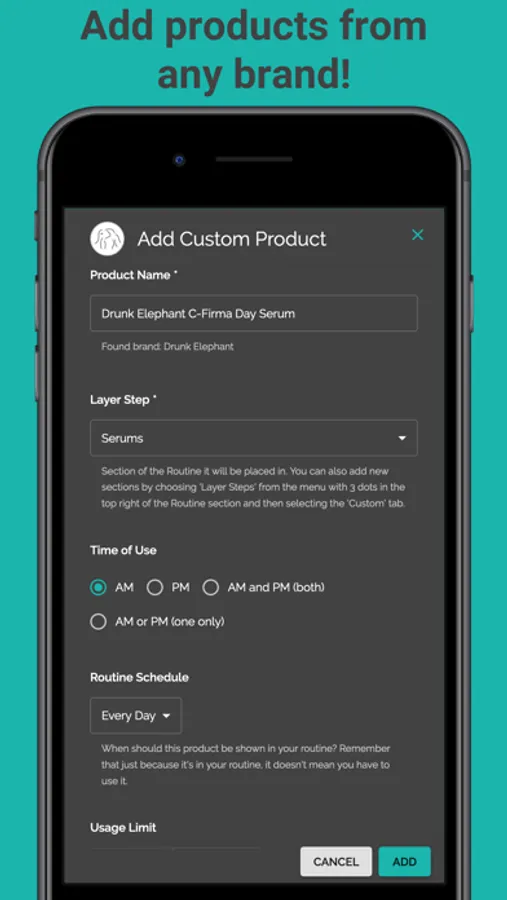 You can add custom skincare products from other brands by selecting the option in the top-right menu in the Routine section or from the Custom tab in the Products section.