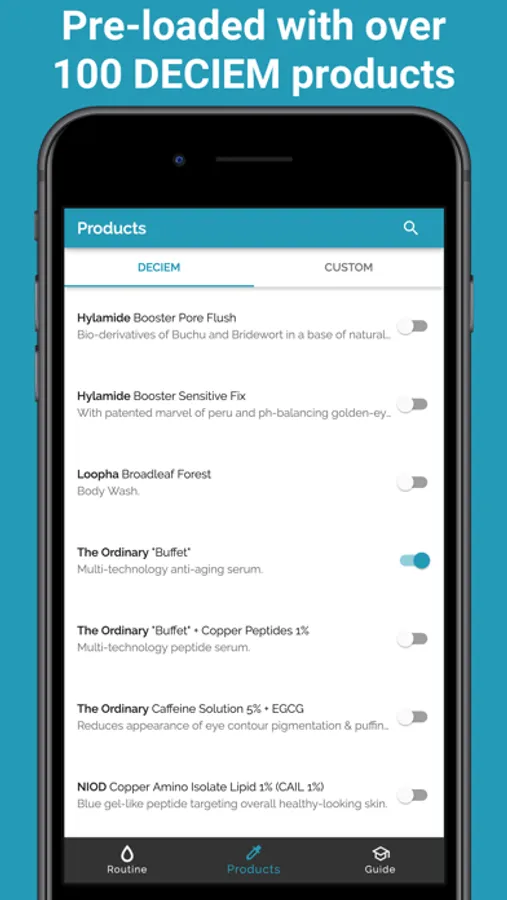 The app comes pre-loaded with DECIEM (The Ordinary, NIOD, Hylamide & Fountain) products but you can add any skin treatments from any brand including Drunk Elephant, Pixi Beauty, Paula's Choice, The Inkey List and any of your favorite brands!