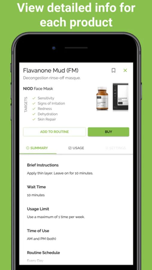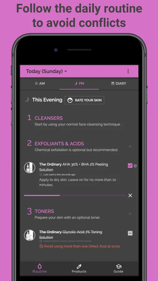Each morning and evening, check each product off your list to keep track of which treatments you have used. This will allow the app to prevent any conflicts by showing you which products should be avoided.