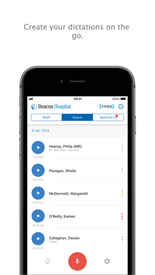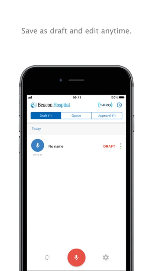The Beacon Dictate iOS app by T-Pro allows users to create dictations on the go, and securely send them to the NOHC platform for processing. Uploaded dictations can be tracked as they are processed by transcription teams or back-end speech recognition servers.