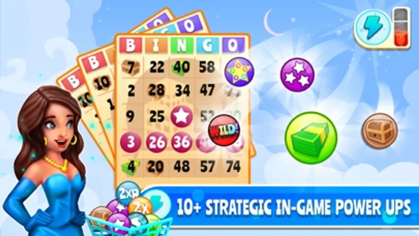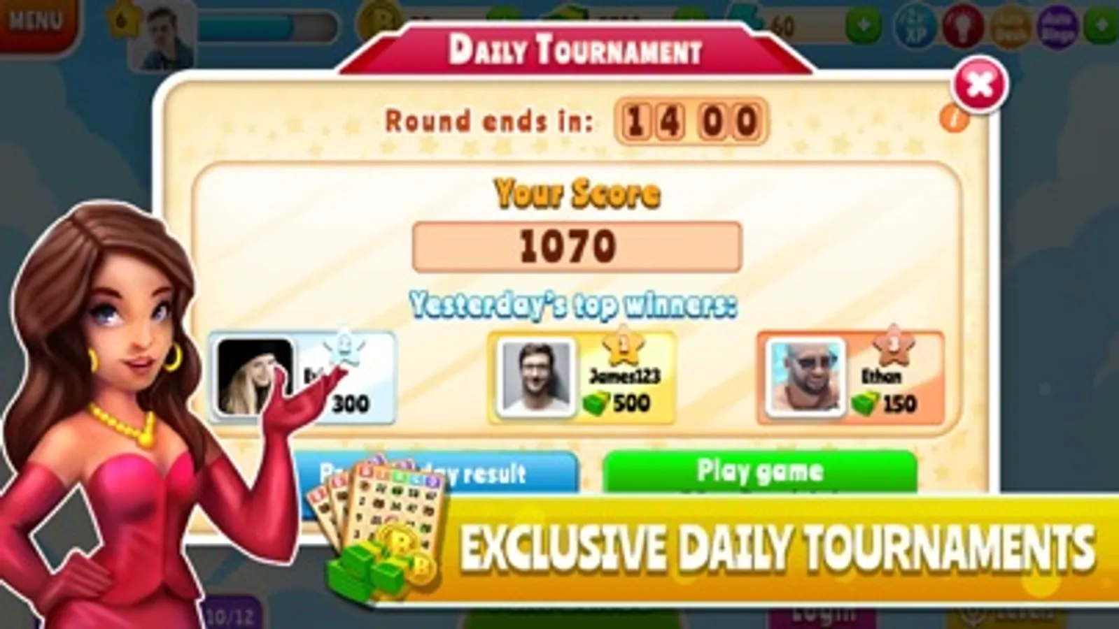 Daily tournament is a best of 5 rounds of the classic Bingo game. Players having the highest points will top the leaderboard. Tournament participants can see opponents' scores in real time. Participants can use power-ups in-game to improve their chances of winning. Players with top scores will win the mega prizes everyday.