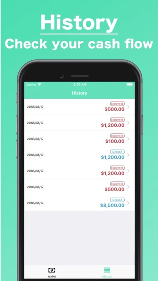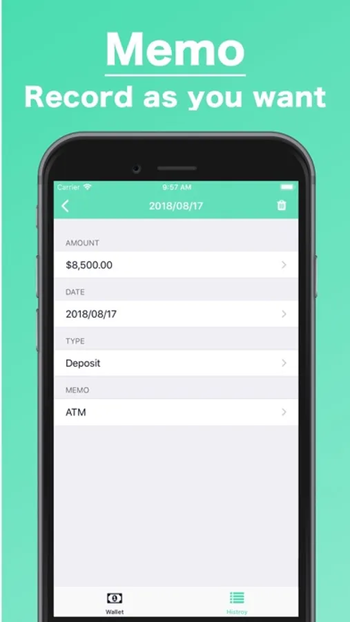 Please record your usage of cash here. When you withdraw money from the bank or pay by cash at merchants, you can instantly record the transaction! If you records every transactions of cash, your wallet's balance can be checked in this app and it prevents from the lack of cash!