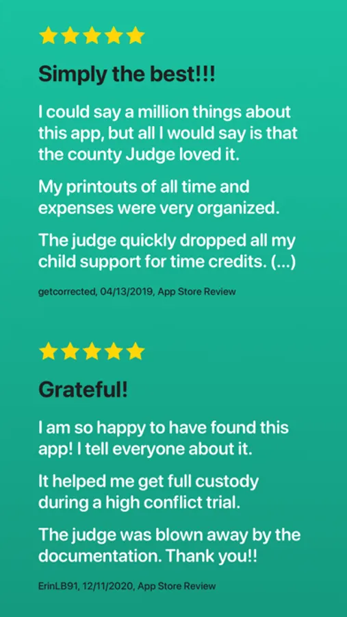 Log pick‑ups, drop‑offs, no‑shows and withheld visitations. Add notes, scans, photos and PDF files. Control the timeshare percentage, total hours and overnights. Keep a history of parent‑child calls (date, time, duration), including unanswered calls. Log expenses and scan receipts. Track reimbursements. Create easy to read, comprehensive court admissible reports.