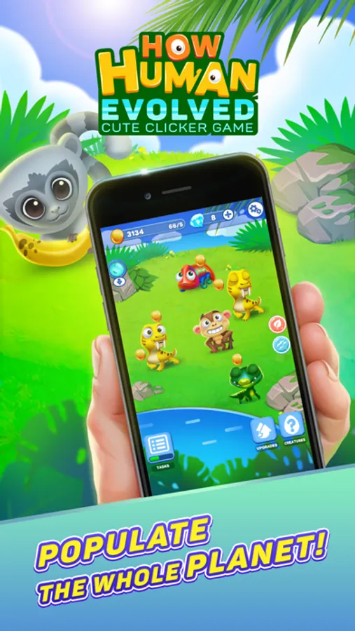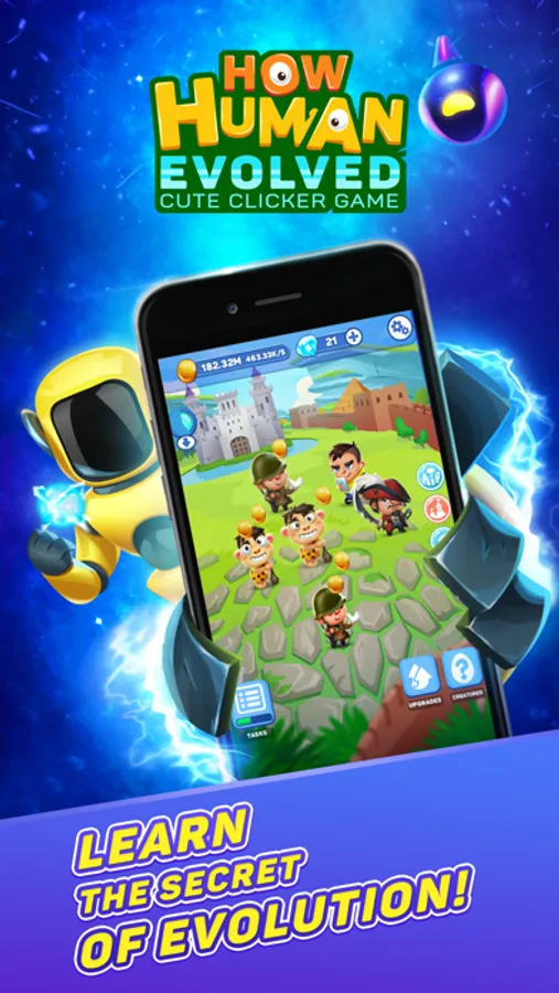 Find out how people appeared on our planet - go through all stages of evolution from simple bacteria and viruses, to fish, lizards and mammals. And of course get to the evolution of a human! Go through all the main stages of the progress of human society from ancient to modern human. But this is not all - you have a unique opportunity to learn how the human will evolve further and take the main part in this. The cyborgs? Robots? Everything can be, you just need to craft all heroes in our clicker game!