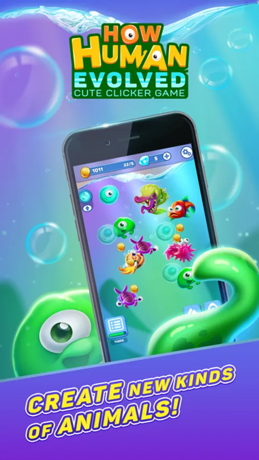 Combine different creatures and get new unique kinds of them. At the first underwater level - it is certainly the simplest single-celled and multicellular bacteria and viruses. Then it's crustaceans and fish. Mutate fish in reptiles, and then in lizards. And so on and so on - get various mysterious creatures :). Our game is not just about one creature, like unicorn evolution, cat evolution, giraffe evolution, cow evolution or shark evolution - in our game "How human evolved: cute clicker game" you can evolve a large number of different animals and of course reach a human!