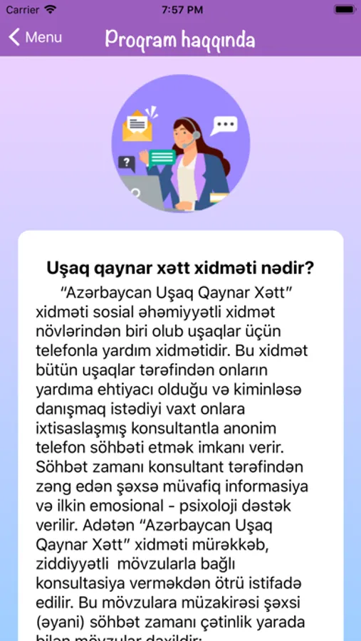 Bu xidmət bütün uşaqlar tərəfindən onların yar¬dı¬ma ehtiyacı olduğu və kiminləsə danışmaq istədiyi vaxt onlara ixtisaslaşmış konsultantla anonim telefon söhbəti etmək imkanı verir. Söhbət zamanı konsultant tərəfindən zəng edən şəxsə müvafiq informasiya və ilkin emosional - psixoloji dəstək verilir. Adətən qaynar xətt xidməti mürəkkəb, ziddiyyətli mövzularla bağlı konsultasiya verməkdən ötrü istifadə edilir. Bu mövzulara müzakirəsi şəxsi (əyani) söhbət zamanı çətinlik yarada bilən mövzular daxildir: şəxsiyyətlərarası və seksual münasibətlər, stiqmalı xəstəliklər, narkotikadan istifadə və cinayətkarlıq.