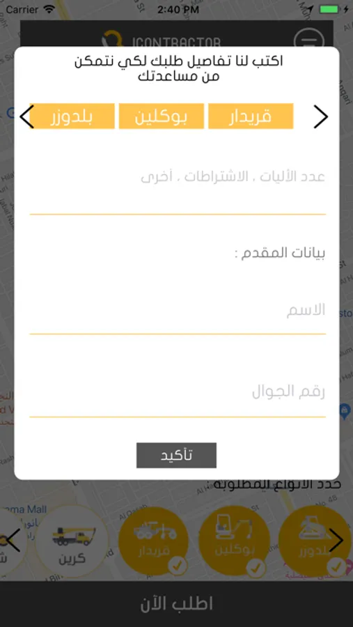تطبيق آي مقاول يقدم لكم اسرع الخدمات لطلب المعدات الثقيلة وشاحنات النقل لكي تتمكن من تنفيذ مشاريعك ونقل شحناتك بشكل أسهل و سريع