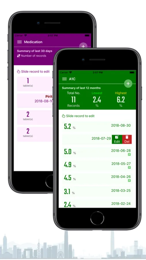 - Use of other logging functions: Blood Pressure, Body Weight, HbA1c and Medication