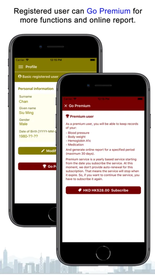 Registered user can become Premium user with a yearly subscription (US$3.99). Premium user can use other logging functions, such as Blood Pressure, Body Weight, HbA1c and Medication. Besides, premium user can also generate online report with records and charts, and a temporary link for viewing on the Internet.