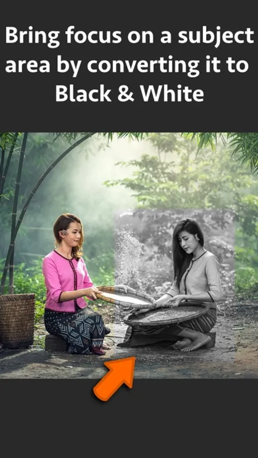 Bring focus on an area by applying Black and White effect only on the selected area of the video.After applying the effect, only the selected region appears in black and white and the remaining area appears in colours. This creates stunning effect. It also helps to highlight a specific area, product or a person in the video.