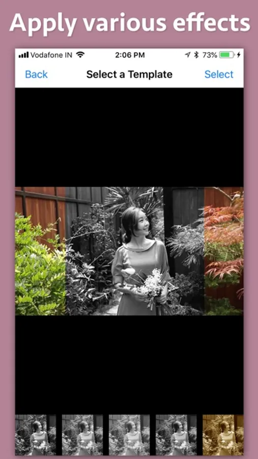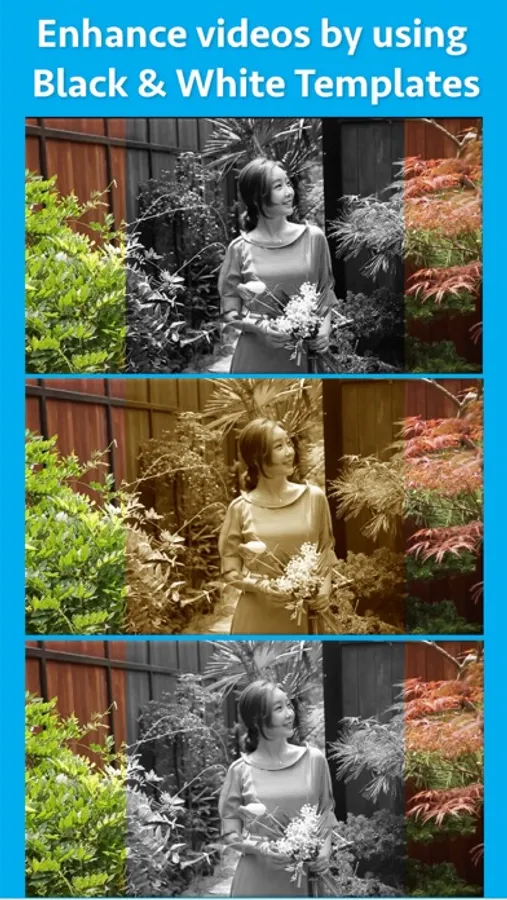 The application also provides different templates to further customise how the Black and White region inside the video should appear. For example : The effects like Noir, Grayscale, Mono, Sepia and Tonal could be applied to the video.