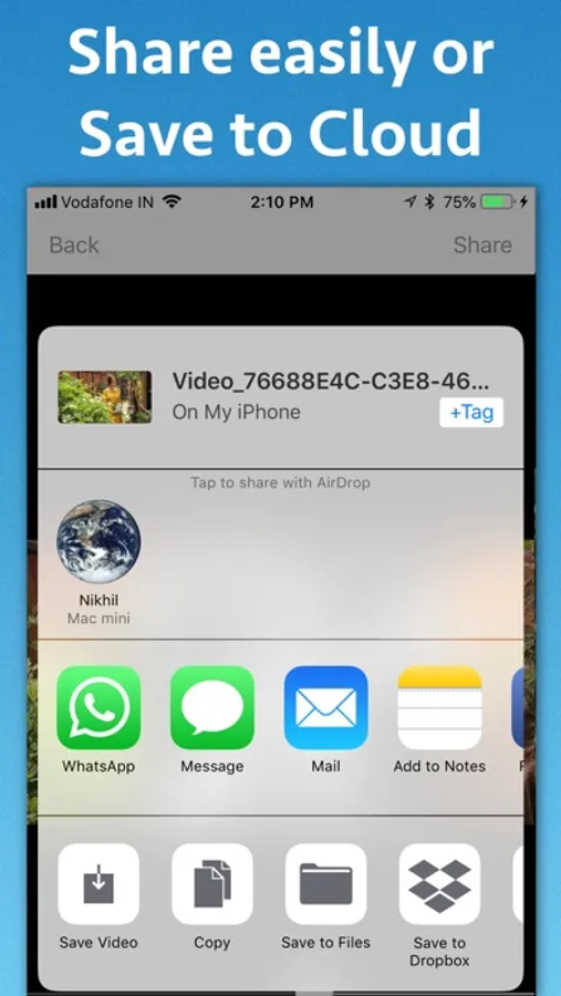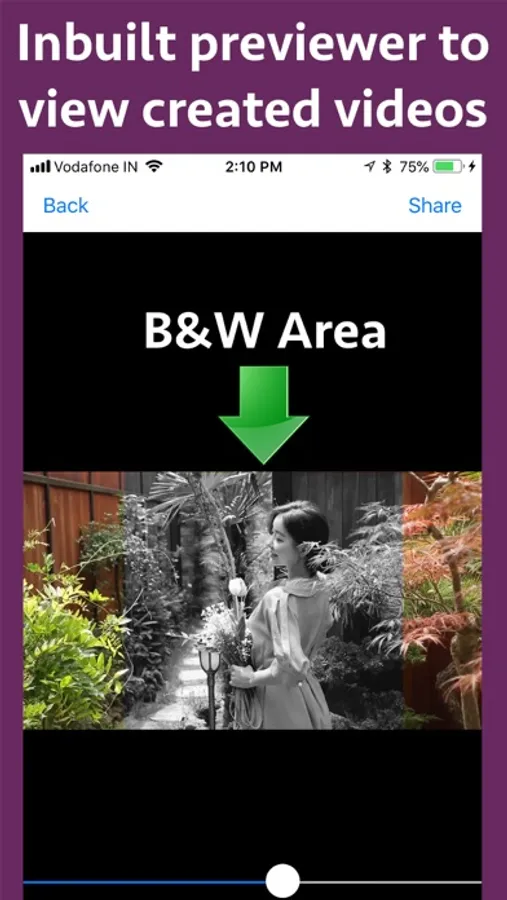 The application also comes with preview feature so that the generated videos could be previewed inside the application directly.The generated videos could be shared using AirDrop or could be saved to Photos app of the phone. The videos could also be shared to cloud by sharing it with the "Files" application of the phone.